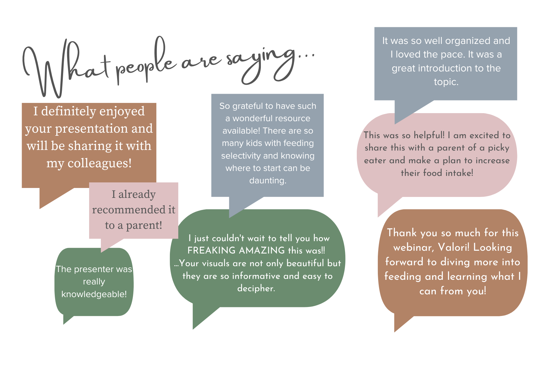 Testimonials featured here are from past attendees of “How to Empower Neurodivergent Kids to Try New Foods.” All were submitted voluntarily in response to a post-training questionnaire and have been anonymized to protect privacy. Attendees may request to withdraw their testimonial at any time.